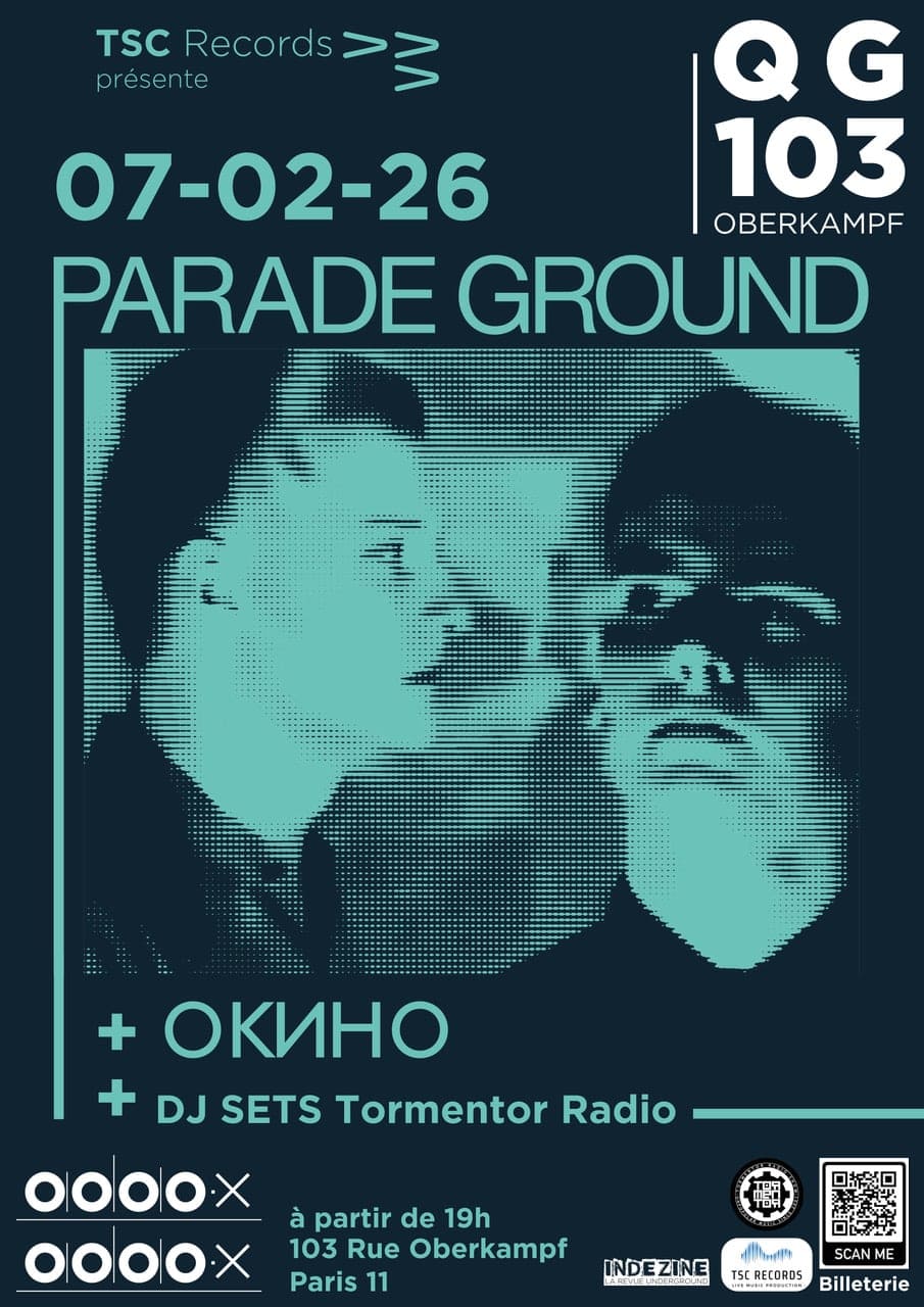Obsküre est particulièrement fier, fier, fier d'être partenaire officiel de cette soirée organisée au QG 103 Oberkampf sous l'égide de TSC Records. Car s'il est un nom qui, en matière de musiques froides et expérimentales, est associé à une forme de culte (l'ambition du binôme n'y est pas pour rien), c'est bien celui des Belges de Parade Ground, dont la persévéfance et l'inscription dans le temps nous inspirent le respect le plus prodond.